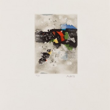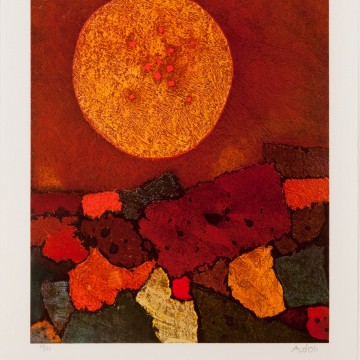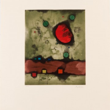 Mordecai Ardon (1896-1992) was born in 1896 in the small Polish village of Tuchow. After World War First he left for Paris and like many Russian and Polish artists only got as far as Berlin where he enrolled to a preparatory Bauhaus class. He found a small room in the house of the older Paul Klee, who became a friend to young Ardon. When the Nazis came to power in 1933, he immigrated to Israel. In leaving Europe he not only lost the stimulating human contacts but also the inspiring museums and exhibitions. In addition, the landscape was different, the sky had a blinding light and the sunsets were overwhelmingly colorful. His reaction was to retreat to his house. The pictures he painted during the first years in Jerusalem were brooding portraits and sunless landscapes. The works revealed a continuous effort to maintain the link with the masters of the past and above all with Rembrandt. Only after a while did he find his own unique style that combined the mysticism of the Kabala along with modern age and the inventions of contemporary art. Ardon was able to render the strong Israeli light not only impressionistically but also internally in conveying the awe-inspiring primeval nature of the land. The landscapes of Israel became mystical elements of signs and inner light. Ardon had exhibitions in New York, Amsterdam, the Venice Biennale and more. A recent retrospective of his works had just been shown at the Israel Museum of Art in Jerusalem.