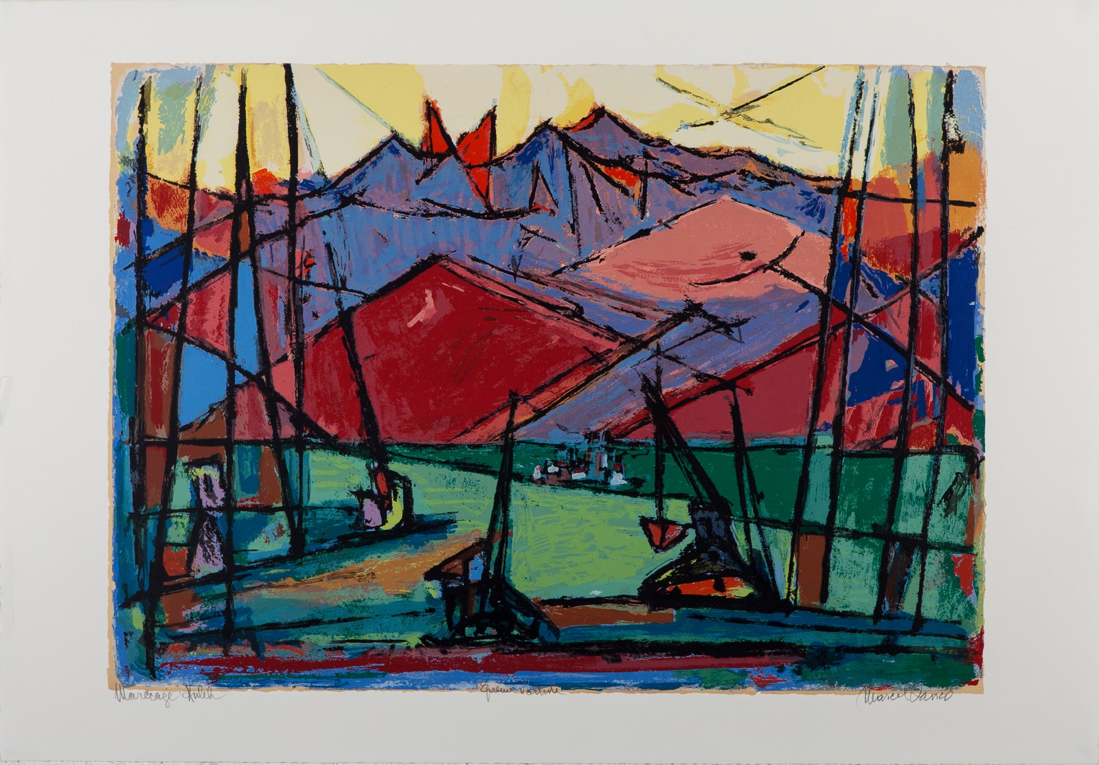 The Huleh Lake, a famous reservoir in the north of Israel, is portrayed by Janco as a pastoral lake surrounded by the edgy mountains of the Galilee. The dominant reds and blues of the mountains capture the beautiful Israeli sunset that colors the landscape in vibrant colors. Janco’s horizontal and diagonal mountain lines are juxtaposed with the vertical lines of the machinery and equipment placed along the banks of the lake ready to dry it. In the past the Lake was considered a hazardous swap, while today it is a flourishing reservoir.