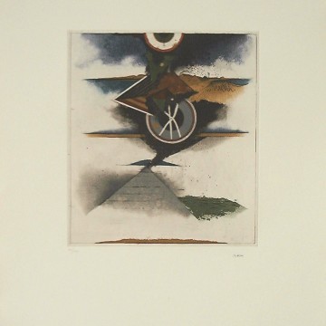 Four Seasons is abstract scenery depicting the four seasons of the year through a mixture of shapes and contrasted colors (brown and black along with white and yellow). Beeri succeeds in creating a dynamic and eventful etching where games of power and dominance exist owing to his mastering of the etching technique.